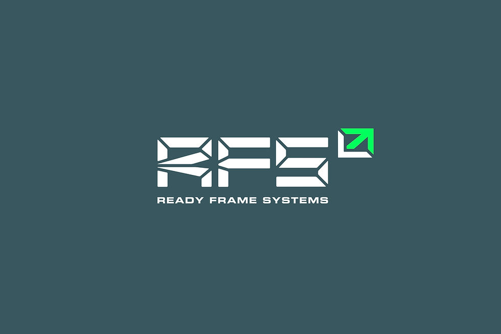 La identidad gráfica de Ready Frame Systems consta de un diseño tipográfico basado en las formas angulares de las vigas metálicas. La flecha en el símbolo representa diseño, tecnología y precisión.